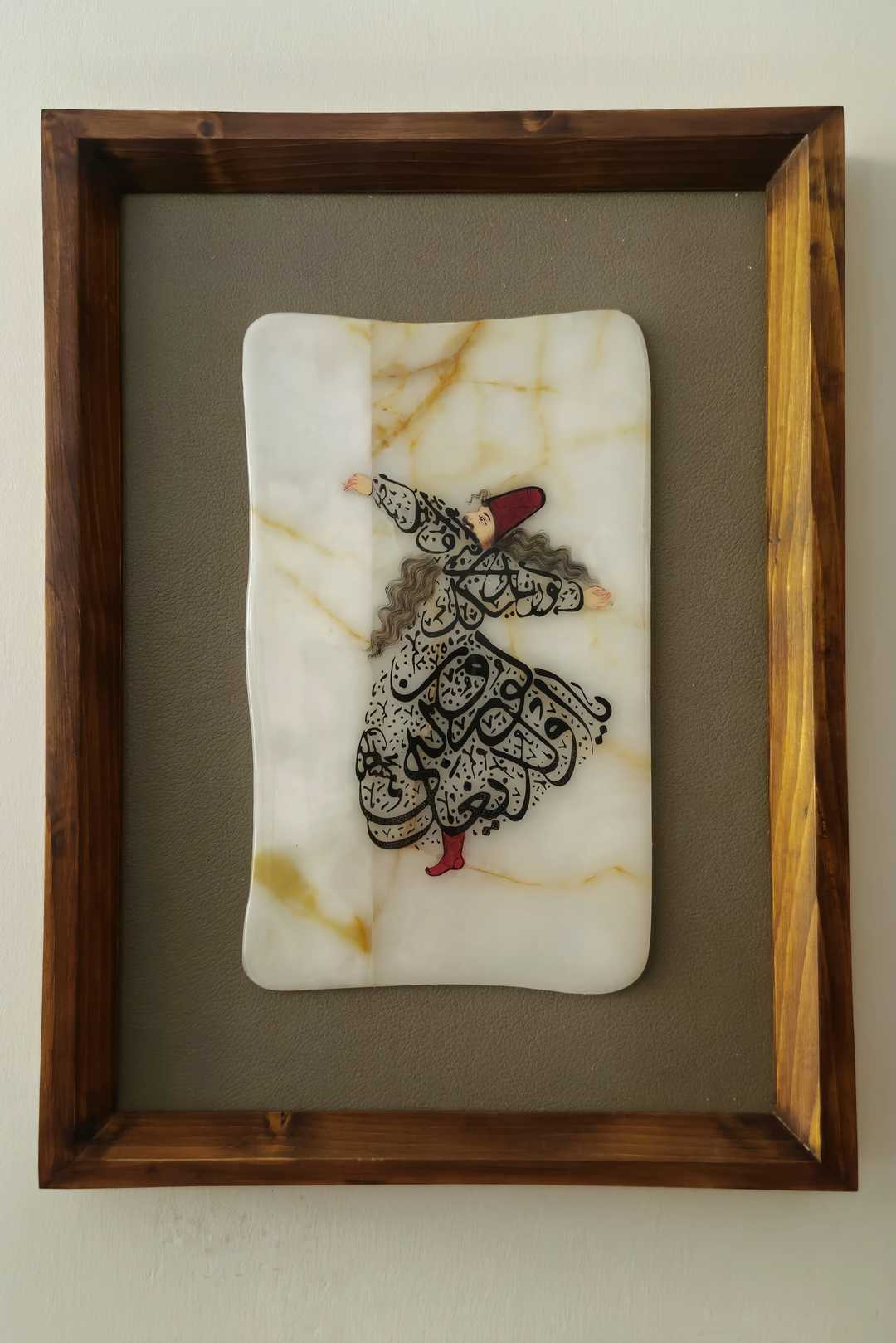 هر بار که قلم روی مرمر می لغزد گویی زمزمه های مولانا و شمس را می شنوی…….. تابلو فوق ترکیب خوشنویسی و نقاشی است . رقص سماع رقصی عارفانه در جستجوی عشق الهی رهایی از خود و رسیدن به وحدت با خداست