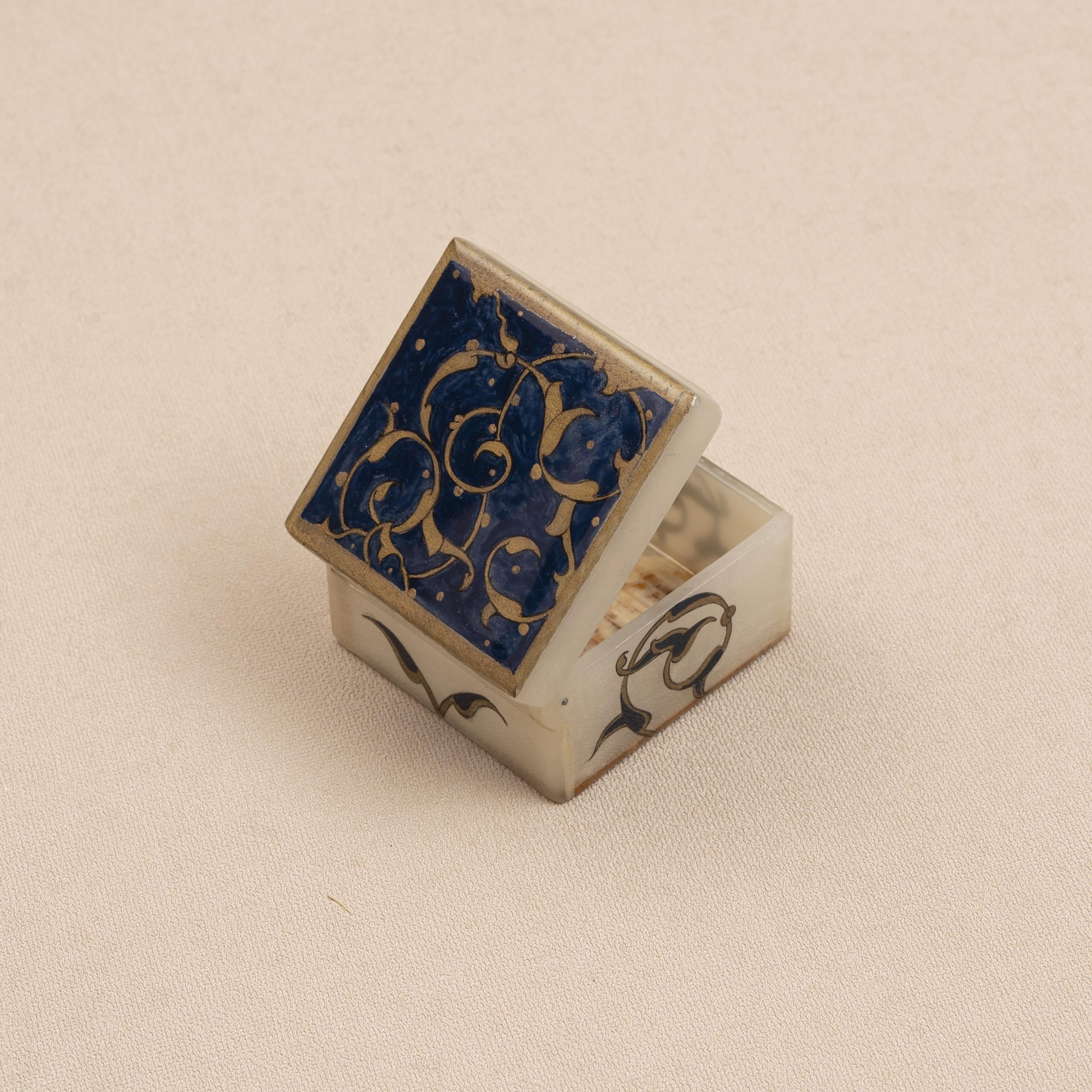 این جعبه ۶*۶ مرمریس،یکی از زیباترین جعبه های تذهیب است ترکیب رنگ طلایی و سورمه ای در روی و کناره های این کار جذابیت چشمگیری به کار داده است