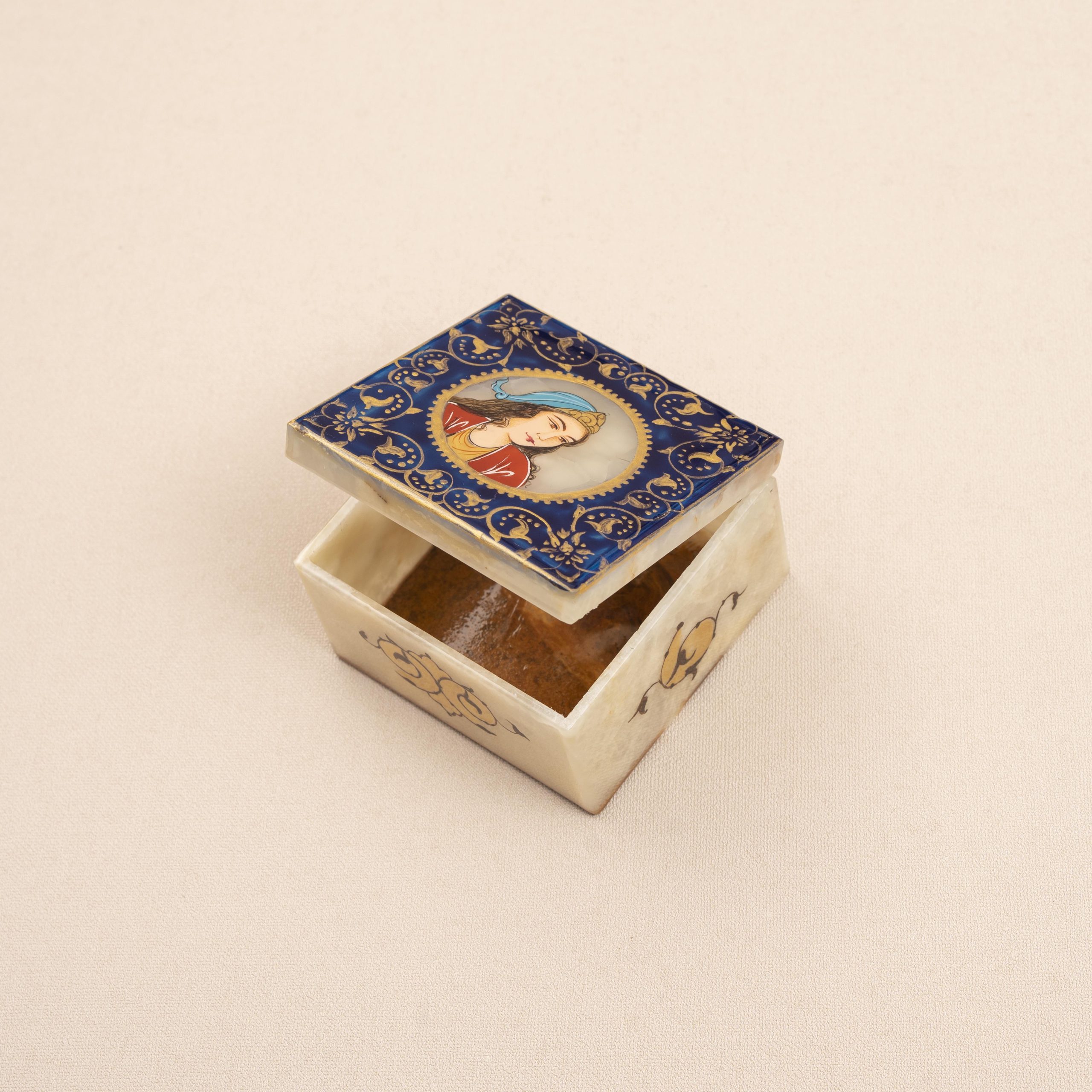 اثر فوق از سری جعبه‌های مربعی مرمریس است که معمولا برای هدیه جواهرات به عزیزی، گزینه پرطرفدار و جذابی به شمار می آید. بر روی این جعبه زیبا، تلفیقی از تذهیب و مینیانور صورت خودنمایی می‌کند که هنر دست سمانه رحمتی است.