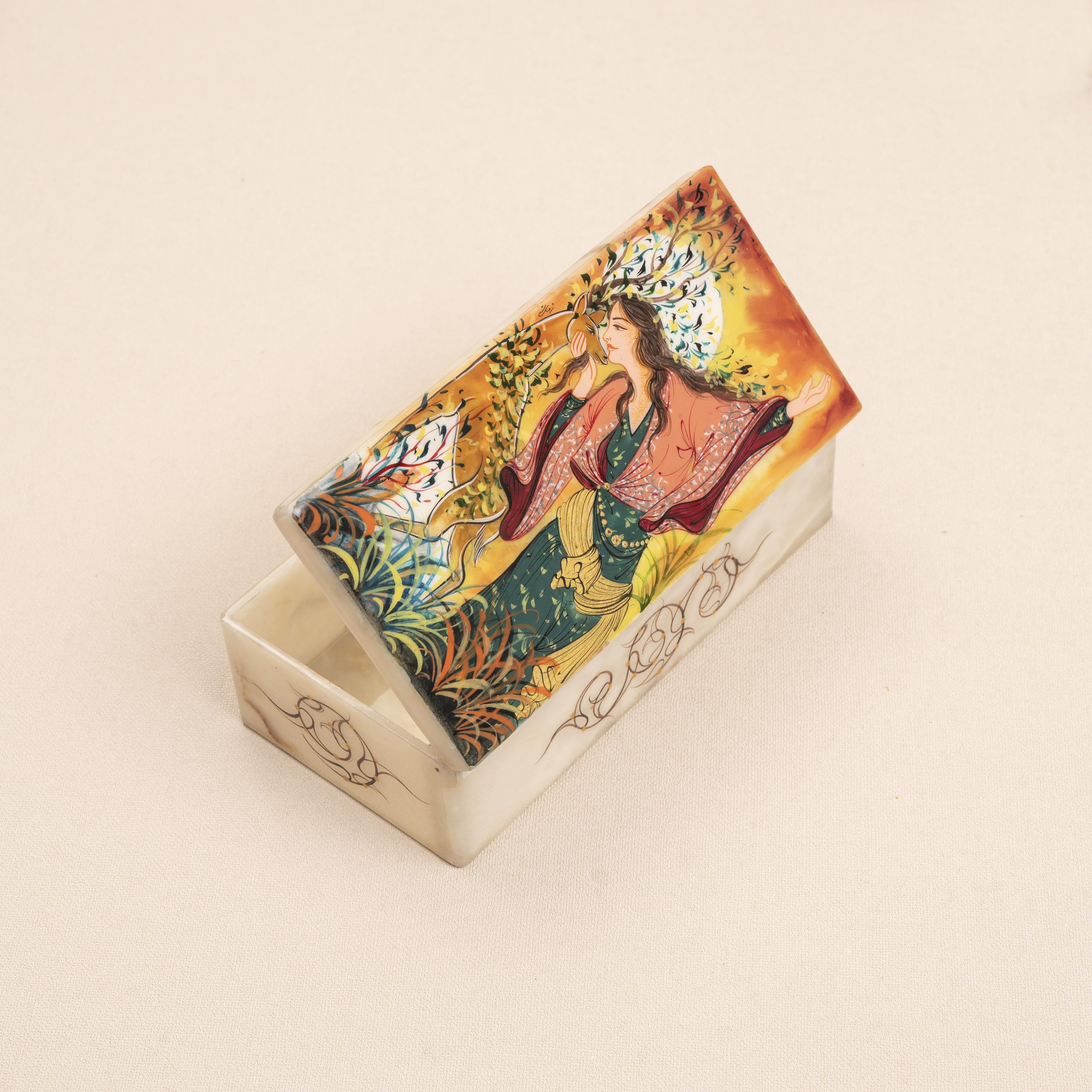 این جعبه مینیاتور زن و آهو زیبا، اثر بانو زمانی است. زن نمادی از ظرافت، لطافت و زیبایی است. آهو نیز درعین ظرافت انعکاسی از پاکی، چابکی و آزادی است؛ ویژگیهایی که در ذات تمام بانوان نهفته است.