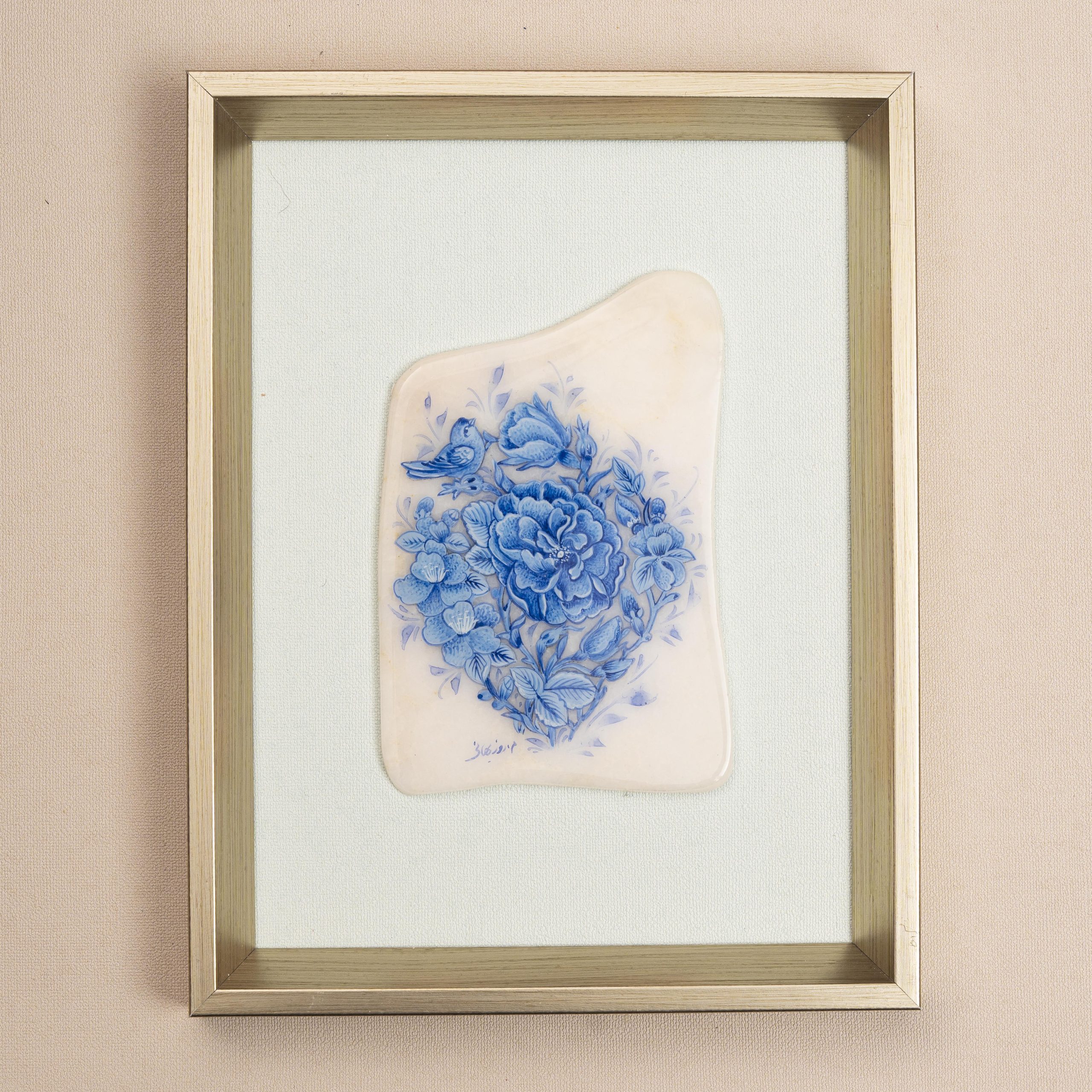 این قاب، اثر هنرمند منصوره روزبهانی است که این نقاشی را با تکنیک پرداز خلق کردهاست. در حقیقت به جای کشیدن قلم بر روی سطح سنگ، با گذاشتن و برداشتن قلم به صورت متناوب و در فاصلههای نزدیک به هم، نقطههایی روی سطح ایجاد کرده که این نقطههای بزرگ و کوچک در کنار هم طراحی را شکل دادهاند. اجرای پرداز نیازمند دقت، ظرافت و زمان زیادی است ولی جذابیت اثر خلق شده، ارزش این همه سختی را دارد. جذابیت دیگر این محصول، استفاده از تک رنگ آبی و مدد از سایه روشنهای این رنگ است که در نهایت محصولی چشمنواز، خاص و سرشار از آرامش را خلق کرده است.