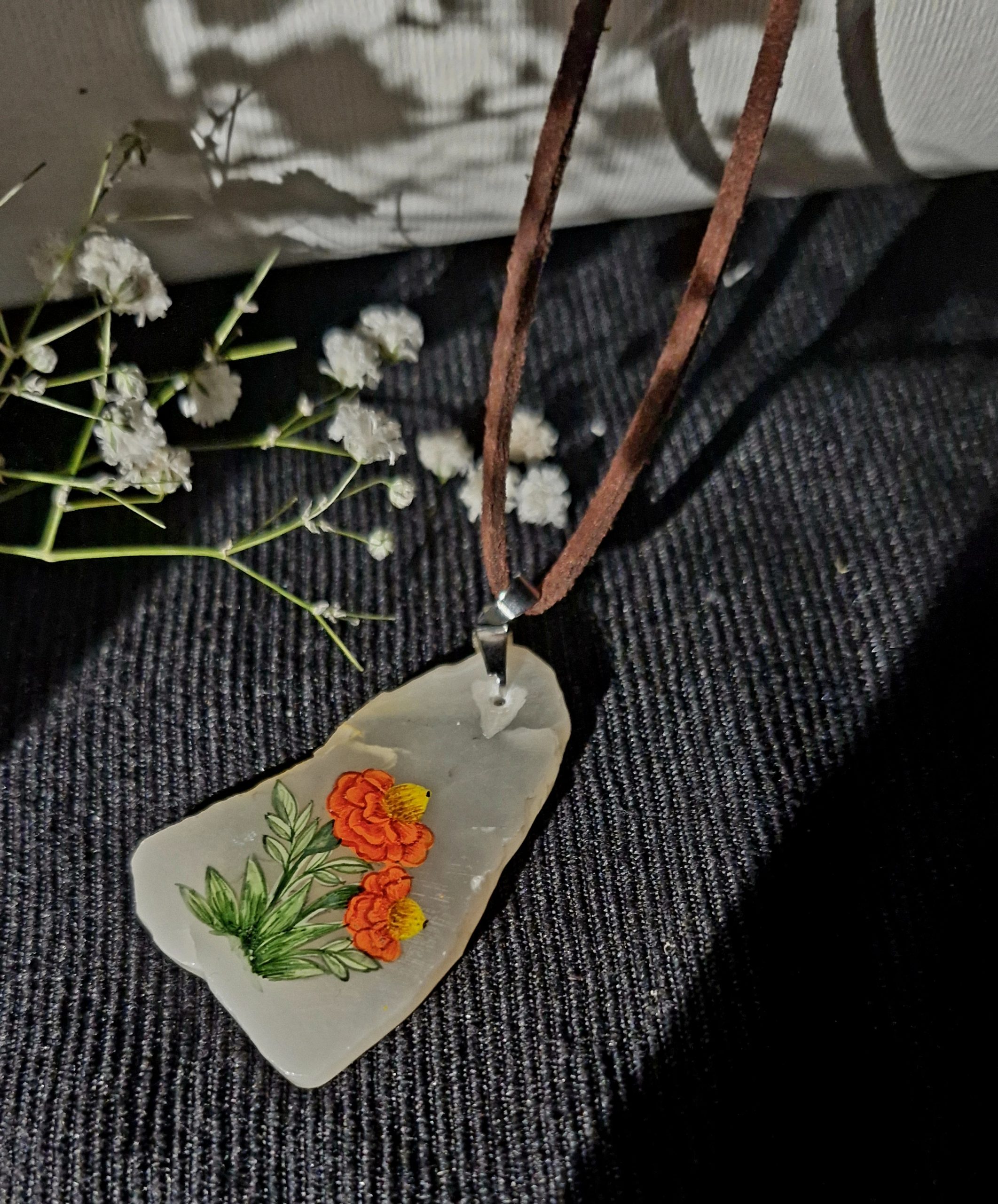 منصوره روزبهانی، هنرمندانه توانسته در یک نقاشی زیبا گردنبند خاص و جذابی را خلق کند